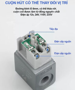 - Điện áp: 12v, 24V, 110V, 220V, tác động khí nén, van cơ