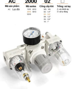 - AC2000-02 : Lọc khí nén bộ 3 kết hợp ( lọc khí nén AF + van điều áp khí nén AR + bình bôi trơn dầu AL ) – thân sizze 2000 – Mức ren 12.7mm = 1/4″ – xả tay